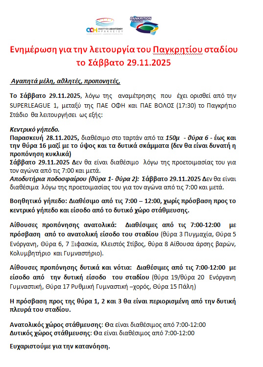 Ενημέρωση για την λειτουργία του Παγκρητίου σταδίου το Σάββατο 29.11.2025 Πλοήγηση άρθρων Προηγούμενο Προηγούμενο άρθρο: ΠΑΡΑΧΩΡΗΣΗ ΧΡΗΣΗ ΚΥΛΙΚΕΙΩΝ ΚΓΝΑΛ – ΕΚΔΗΛΩΣΗ KICKBOXING 5-7.12.2025