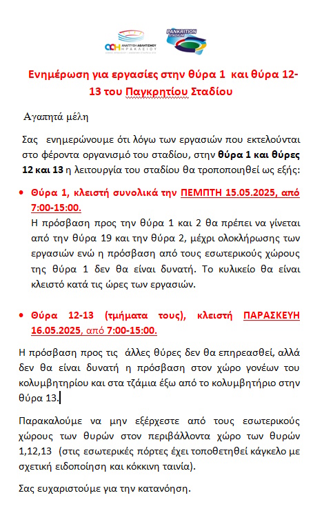 ΕΝΗΜΕΡΩΣΗ ΓΙΑ ΕΡΓΑΣΙΕΣ ΘΥΡΑ 1, 12, 13 ΠΑΓΚΡΗΤΙΟΥ ΣΤΑΔΙΟΥ Πλοήγηση άρθρων Προηγούμενο Προηγούμενο άρθρο: ΕΚΤΑΚΤΗ ΑΝΑΚΟΙΝΩΣΗ ΛΕΙΤΟΥΡΓΙΑ ΘΥΡΩΝ 20, 19, 18 Παγκρητίου ΣταδίουΕπόμενα Επόμενο άρθρο: ΕΝΗΜΕΡΩΣΗ ΓΙΑ ΧΛΟΟΤΑΠΗΤΑ ΚΕΝΤΡΙΚΟΥ ΓΗΠΕΔΟΥ ΠΑΓΚΡΗΤΙΟΥ ΣΤΑΔΙΟΥ