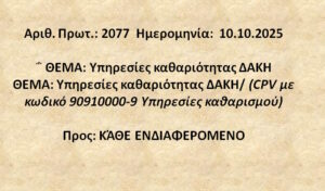 Αριθ. Πρωτ.: 1485Ημερομηνία: 14.07.2025 ΘΕΜΑ: Υπηρεσίες καθαριότητας ΔΑΚΗ CPV με κωδικό 90910000-9 Υπηρεσίες καθαρισμού) Προς: ΚΑΘΕ ΕΝΔΙΑΦΕΡΟΜΕΝΟ ΠΡΟΣΚΛΗΣΗ ΥΠΟΒΟΛΗΣ ΟΙΚΟΝΟΜΙΚΗΣ ΠΡΟΣΦΟΡΑΣΑξιότιμοι κύριοι,Η Ανάπτυξη Αθλητισμού Ηρακλείου,…